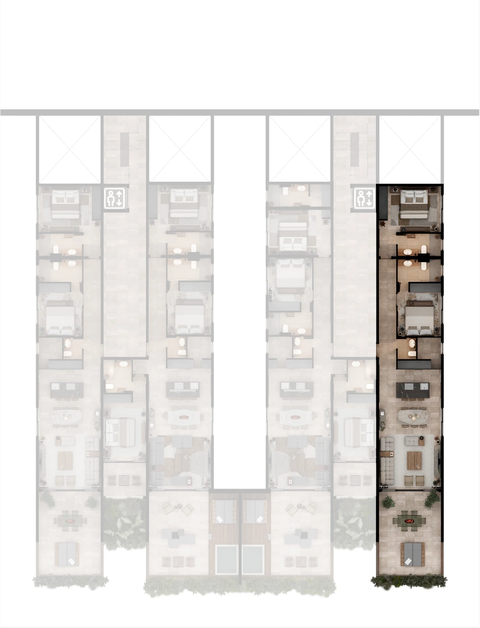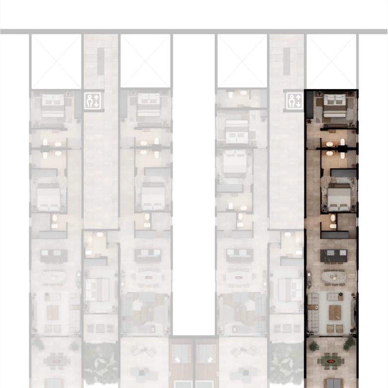 Selected residences feature private jacuzzis, while the upper penthouses offer expansive terraces and uninterrupted sea views.