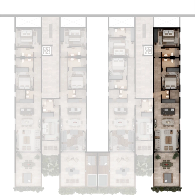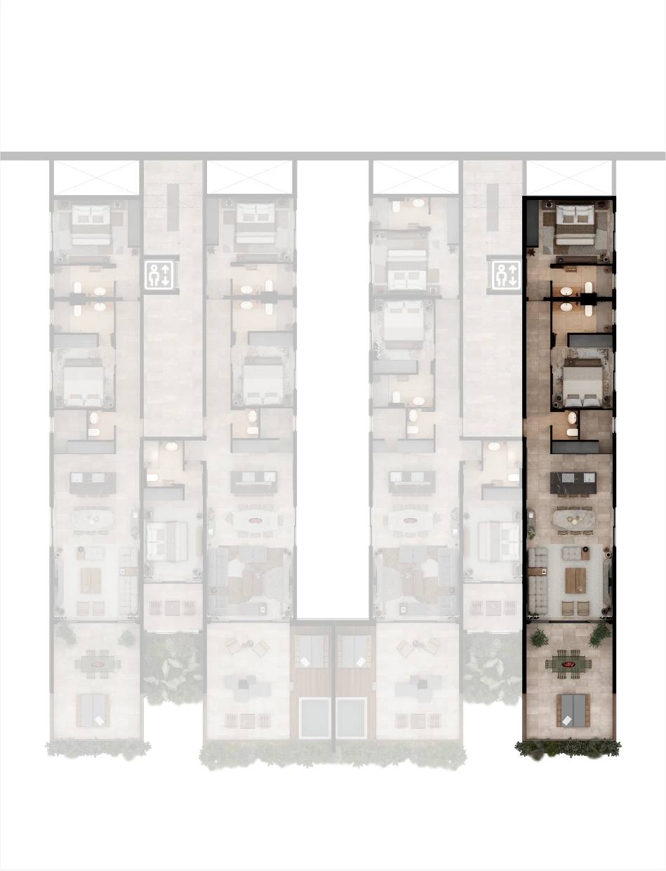 Selected residences feature private jacuzzis, while the upper penthouses offer expansive terraces and uninterrupted sea views.