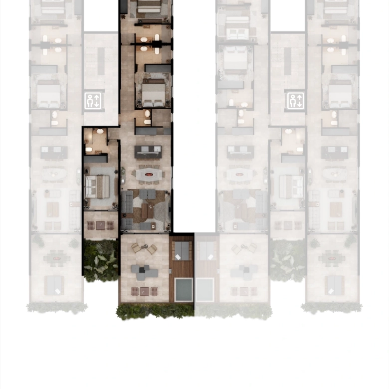 Selected residences feature private jacuzzis, while the upper penthouses offer expansive terraces and uninterrupted sea views.