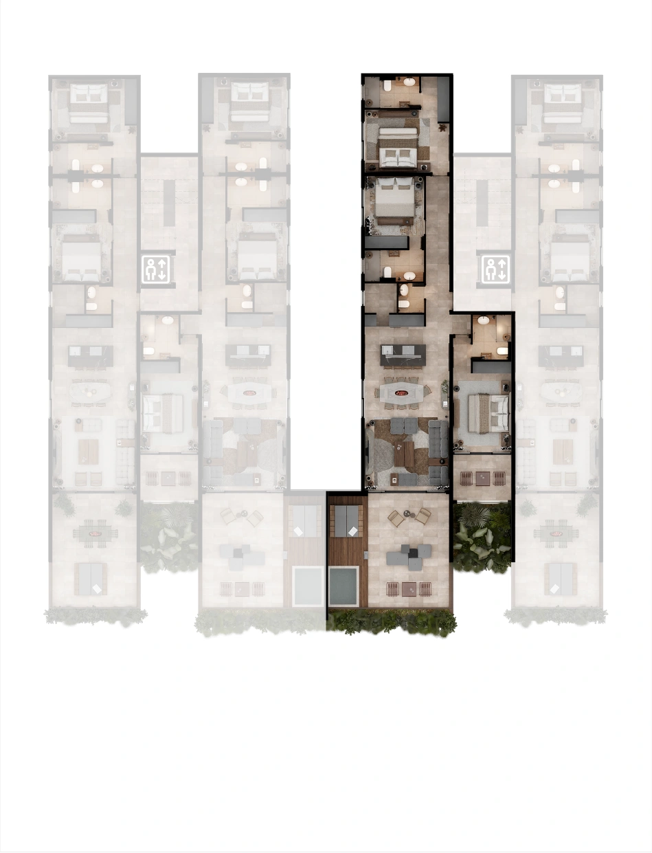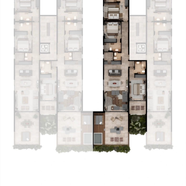 Selected residences feature private jacuzzis, while the upper penthouses offer expansive terraces and uninterrupted sea views.