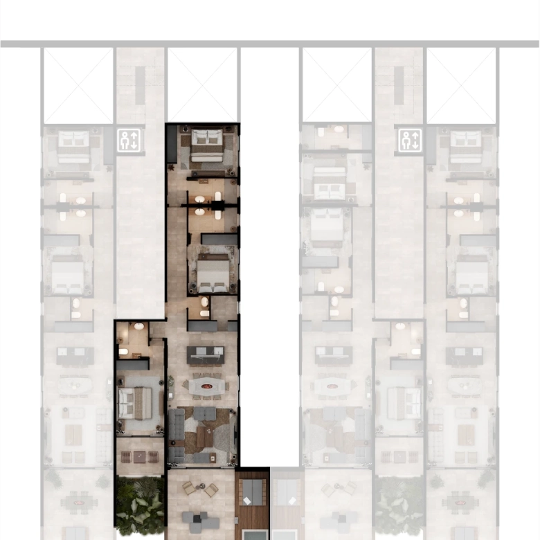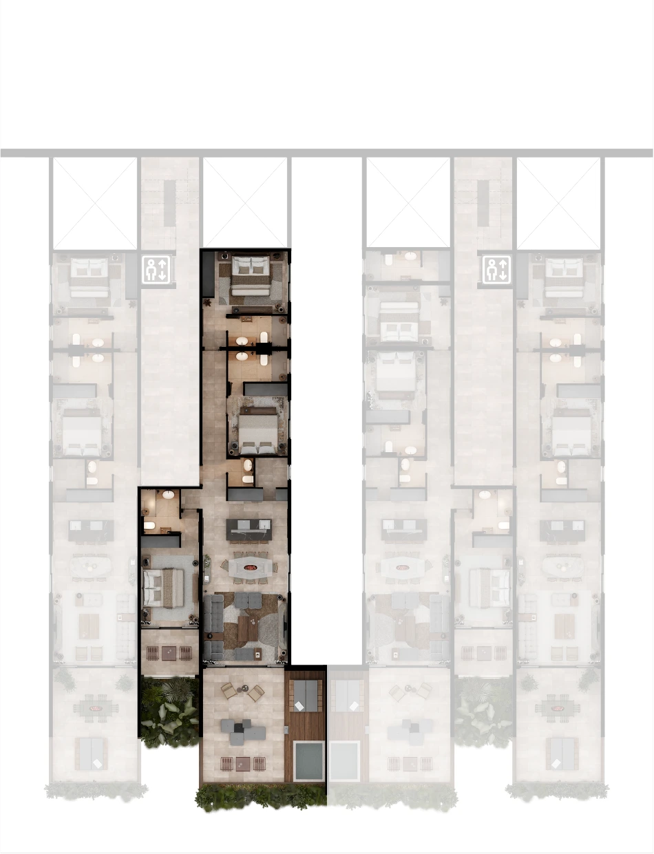 Selected residences feature private jacuzzis, while the upper penthouses offer expansive terraces and uninterrupted sea views.