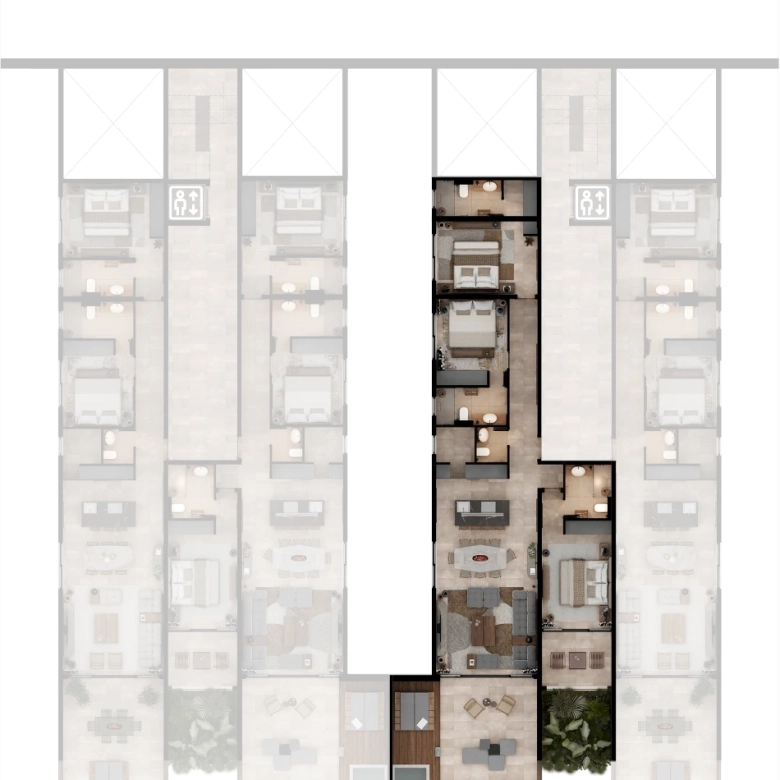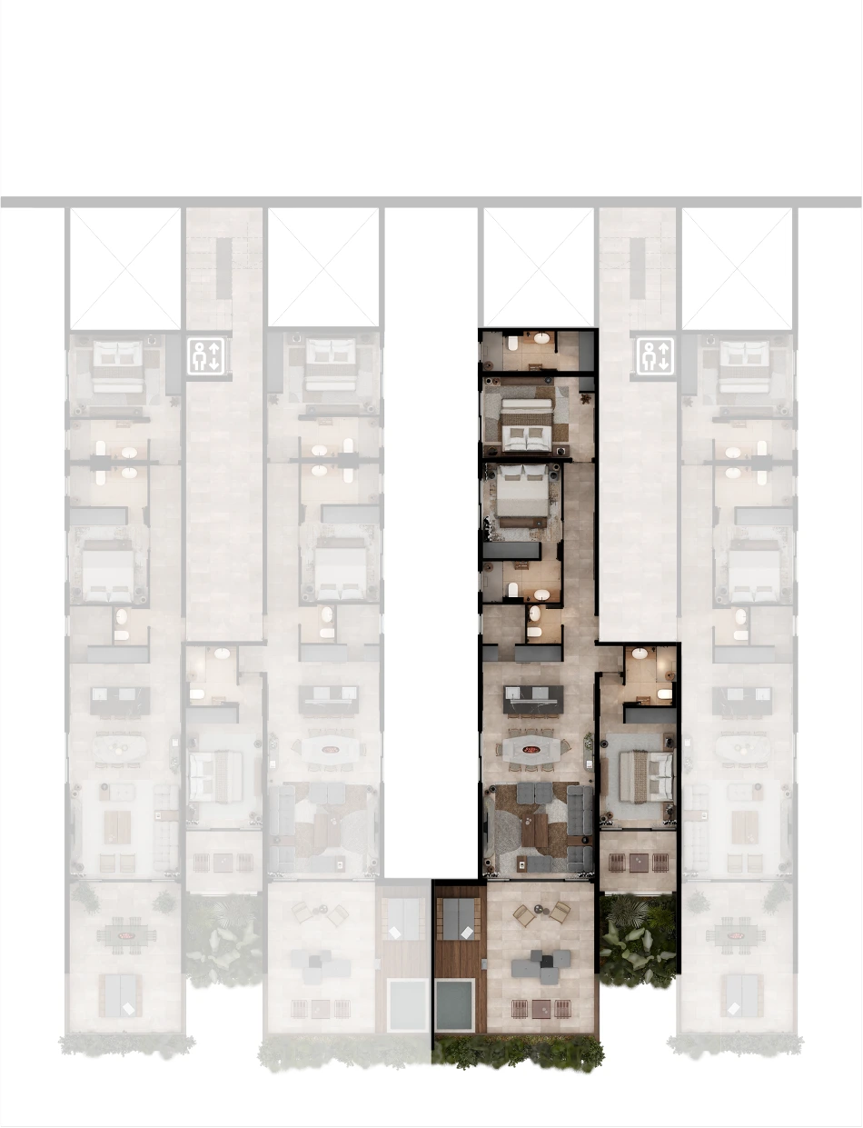 Selected residences feature private jacuzzis, while the upper penthouses offer expansive terraces and uninterrupted sea views.