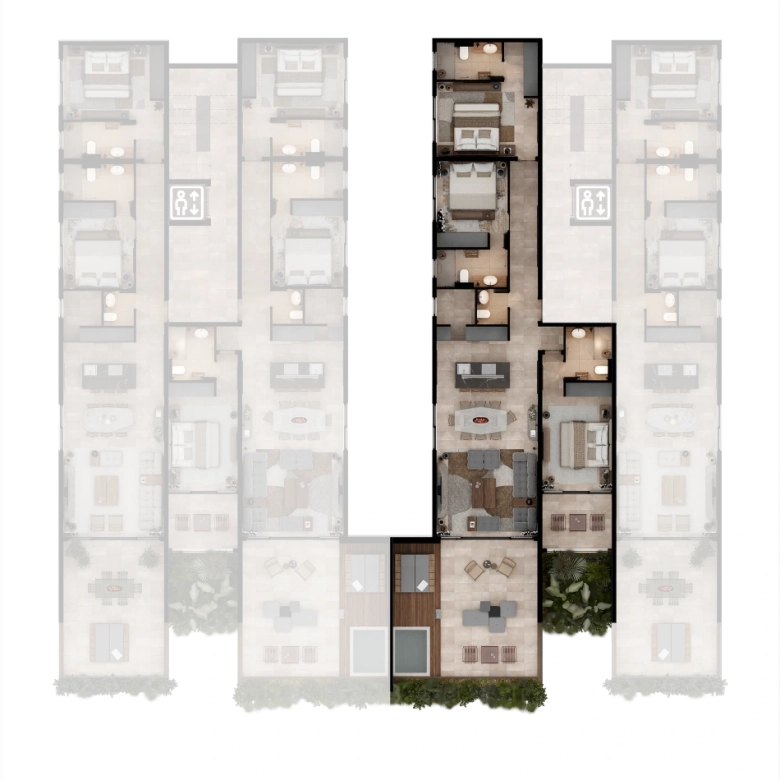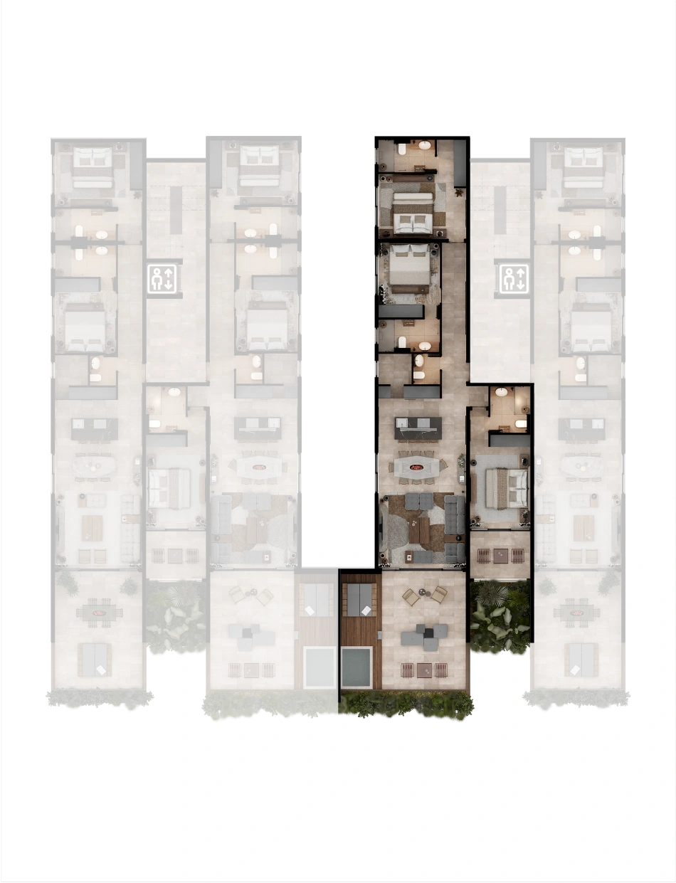 Selected residences feature private jacuzzis, while the upper penthouses offer expansive terraces and uninterrupted sea views.