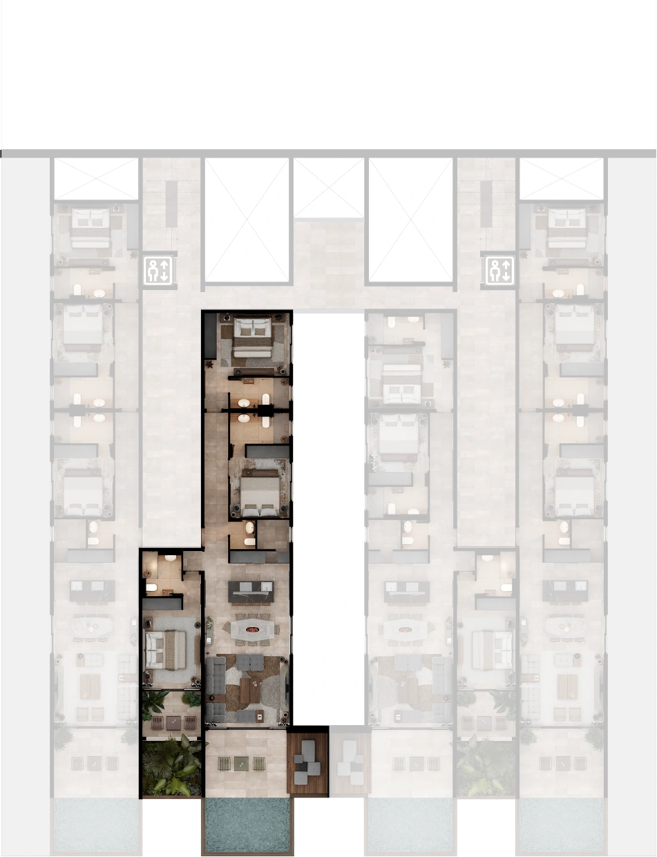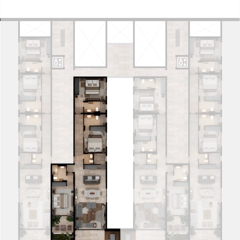 Selected residences feature private jacuzzis, while the upper penthouses offer expansive terraces and uninterrupted sea views.